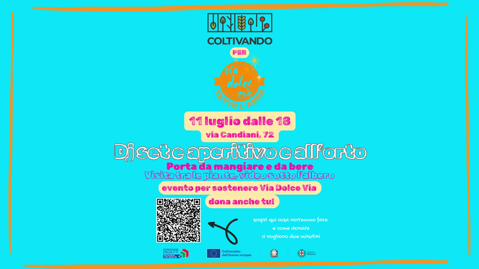 On Friday, July 11th, a special event will take place at the Coltivando Garden: a shared aperitif accompanied by a DJ set, aimed at supporting the crowdfunding project “Via Dolce Via Tutto l’Anno.”