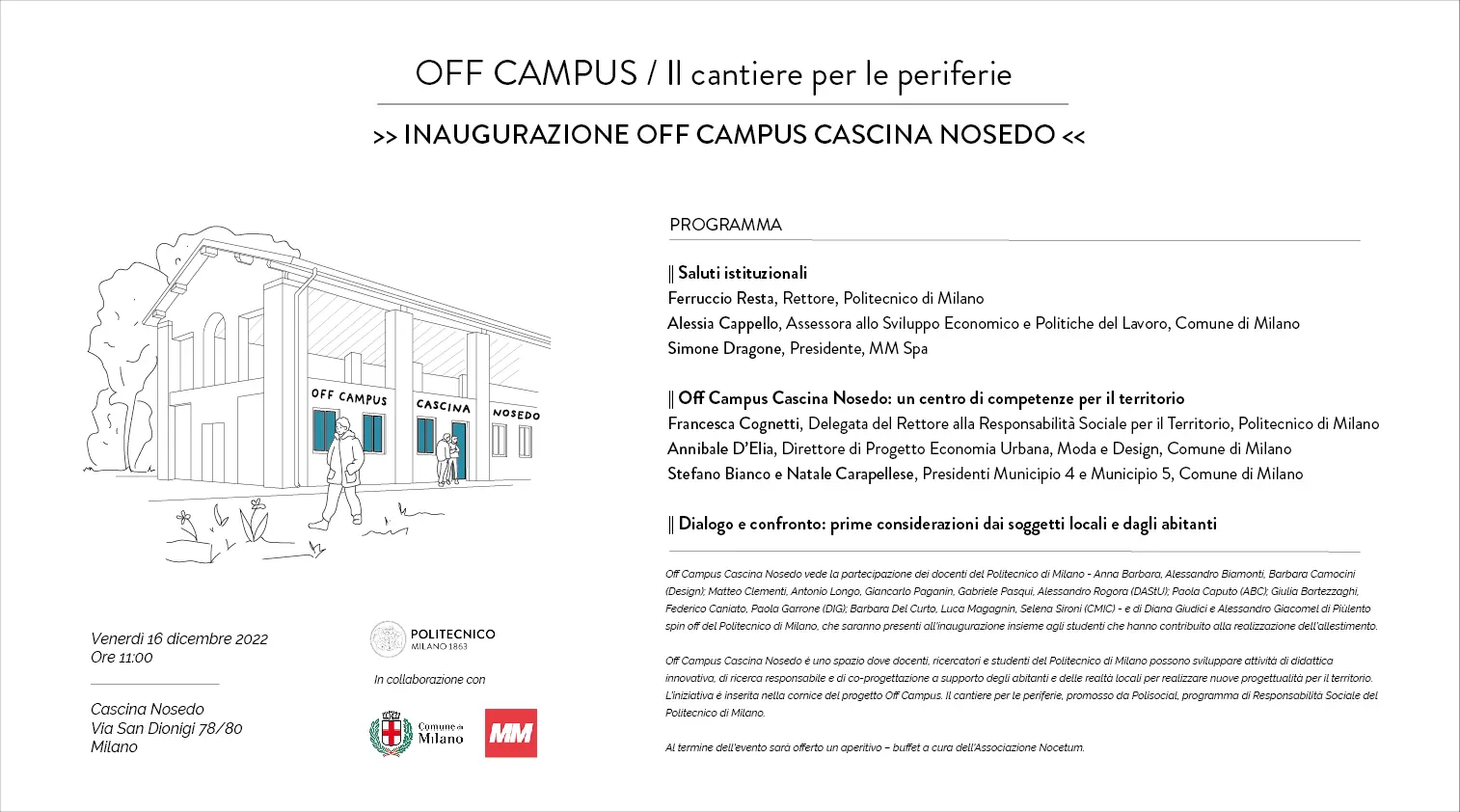 The Off Campus Cascina Nosedo project is curated by the Politecnico di Milano, with the collaboration of the City of Milan.