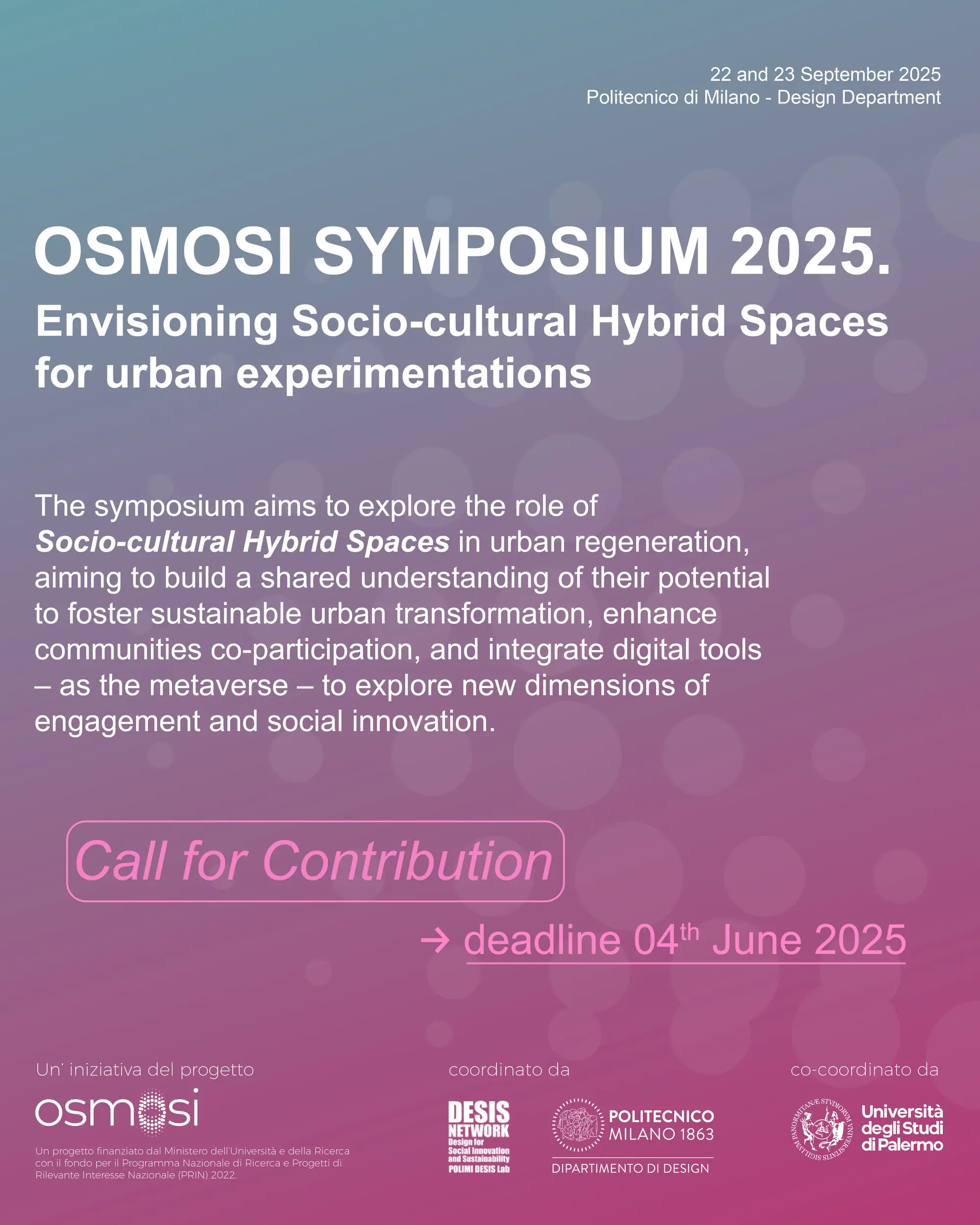 An interdisciplinary Symposium organised within the framework of the research project “OSMOSI. Observation and Study of Design and Development Models of hybrid Spaces, places of urban experimentation and social Inclusion through creative and cultural activities" – Project funded by the Ministry of University and Research through the National Research Program and Projects of Relevant National Interest (PRIN) 2022 fund. This action-research project is coordinated by the Polimi DESIS Lab Research Group, operating within the Department of Design at Politecnico di Milano, within the co-coordination by the University of Palermo through its Department of Architecture. Additional contributions come from the Department of Architecture, Built Environment and Construction Engineering and the Department of Management Engineering at Politecnico di Milano, as well as the Pedagogical and Psychological Department at the University of Palermo. The research is supported by two key Socio-cultural Hybrid Spaces located in the regions under investigation: BASE Milano in Lombardy and Farm Cultural Park in Sicily.