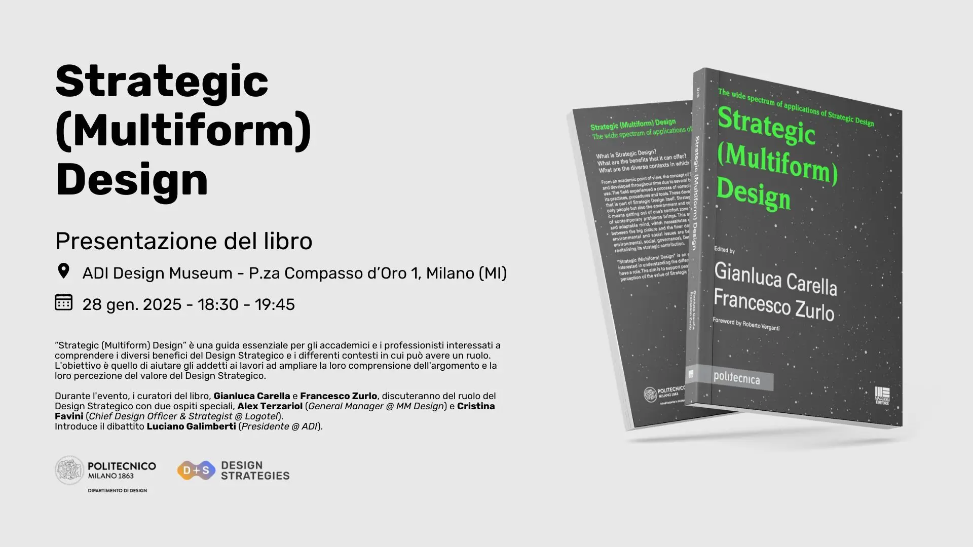 The book Strategic (Multiform) Design. The wide spectrum of applications of Strategic Design edited by Gianluca Carella and Francesco Zurlo, with contributions on the subject from various colleagues, has been published in the Politecnica series by Maggioli Editore.