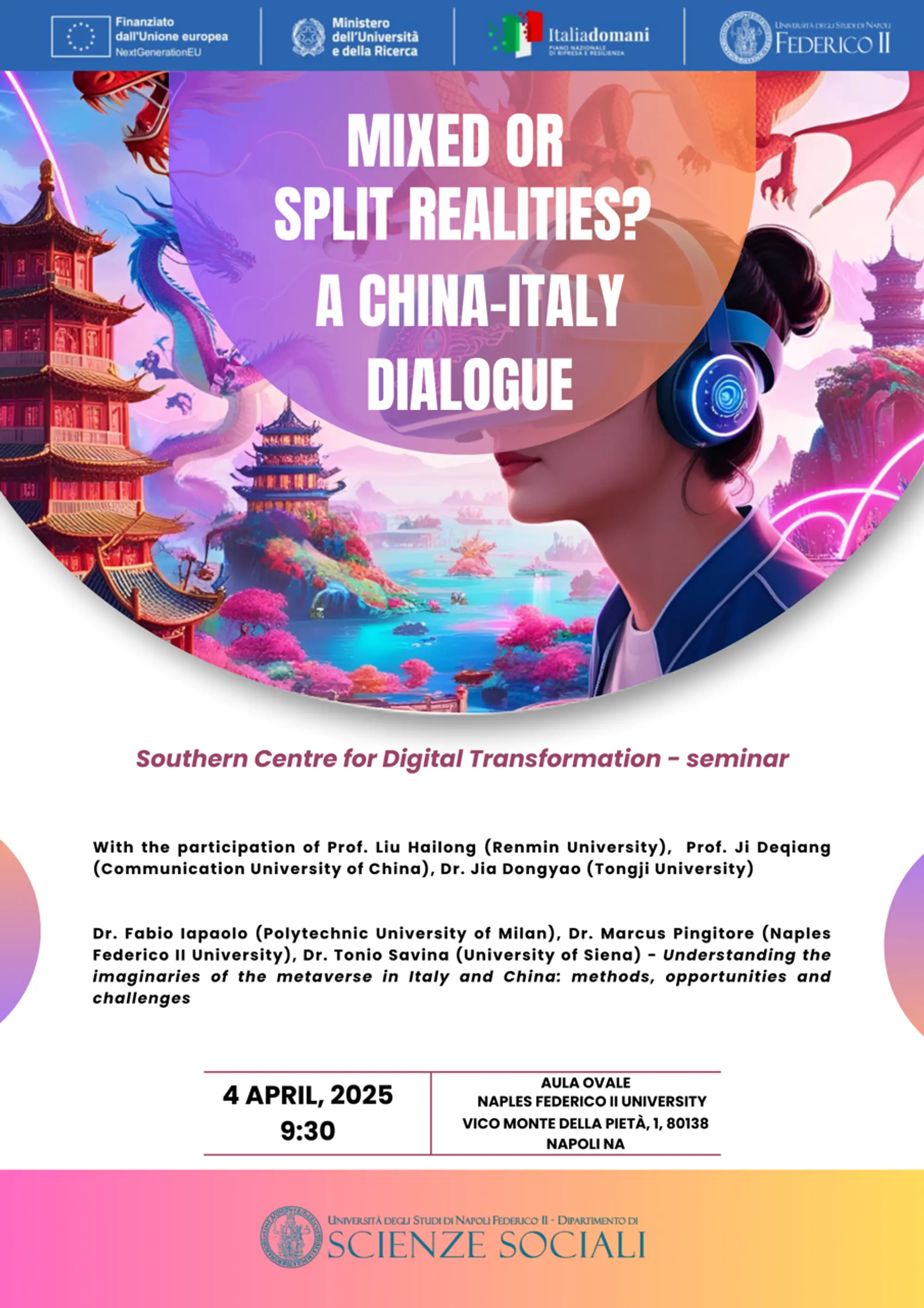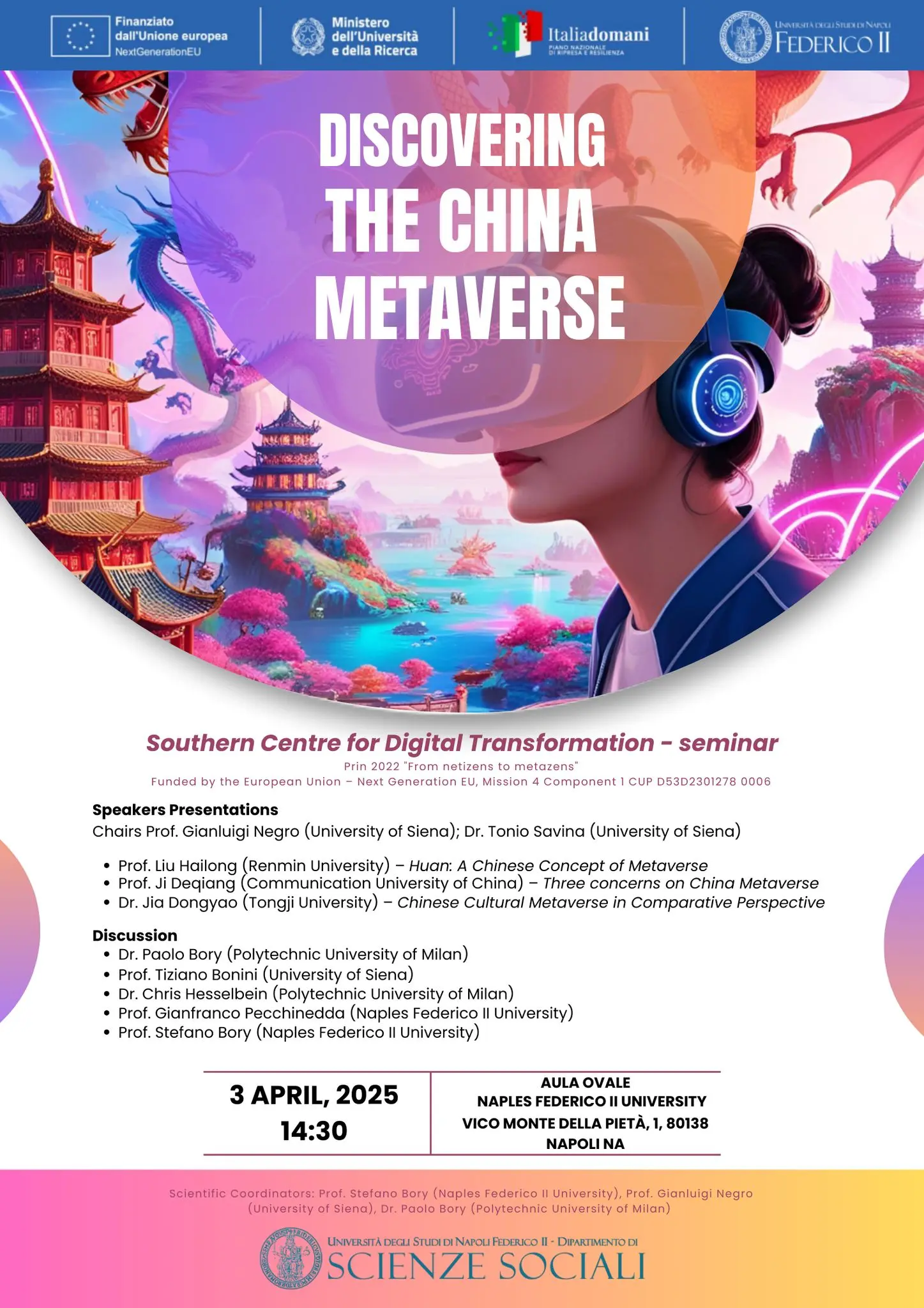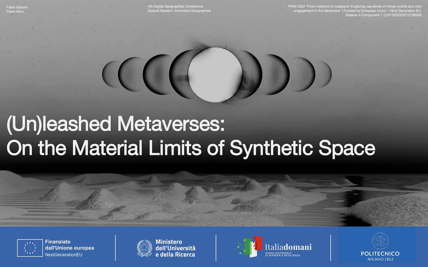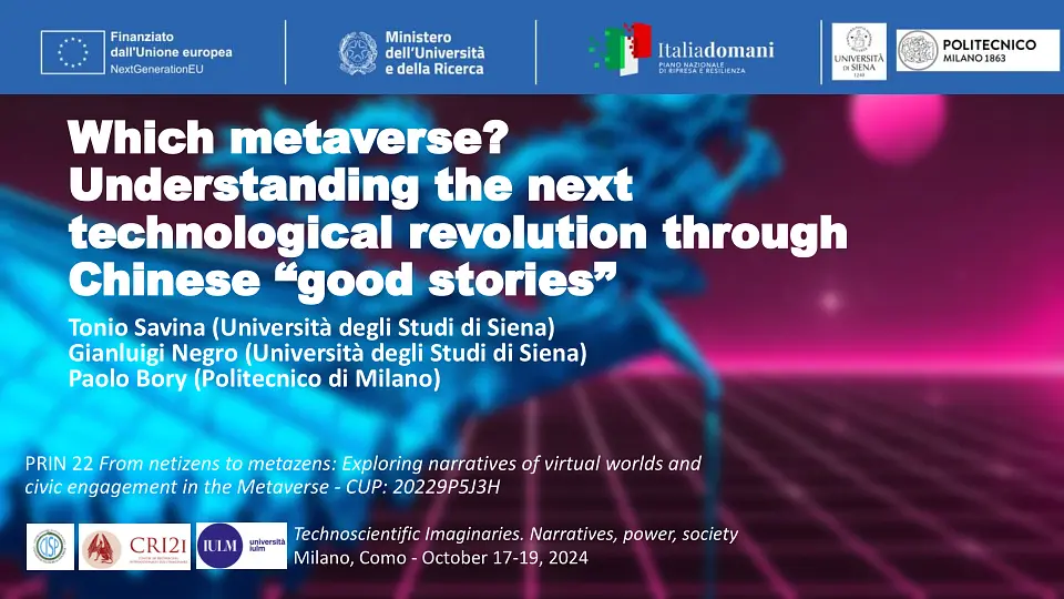 Il progetto di ricerca finanziato nell'ambito del PRIN 2022 indaga da una prospettiva socio-culturale le principali narrazioni dei mondi emergenti di realtà virtuale e aumentata basati sul progetto Metaverso, annunciato dal CEO di META Mark Zuckerberg nell'ottobre 2021. A partire dalla letteratura e dagli studi sui mondi virtuali e sugli ambienti digitali nei media studies, STS e negli studi sugli immaginari socio-tecnici, il progetto si propone di rintracciare e analizzare le narrazioni mainstream e le pratiche discorsive che co-costruiscono il Metaverso come tecnologia e spazio di interazione sociale, analizzando le interpretazioni e le attività degli “early users” e delle piattaforme basate sul Metaverso nel contesto italiano e nel contesto cinese.