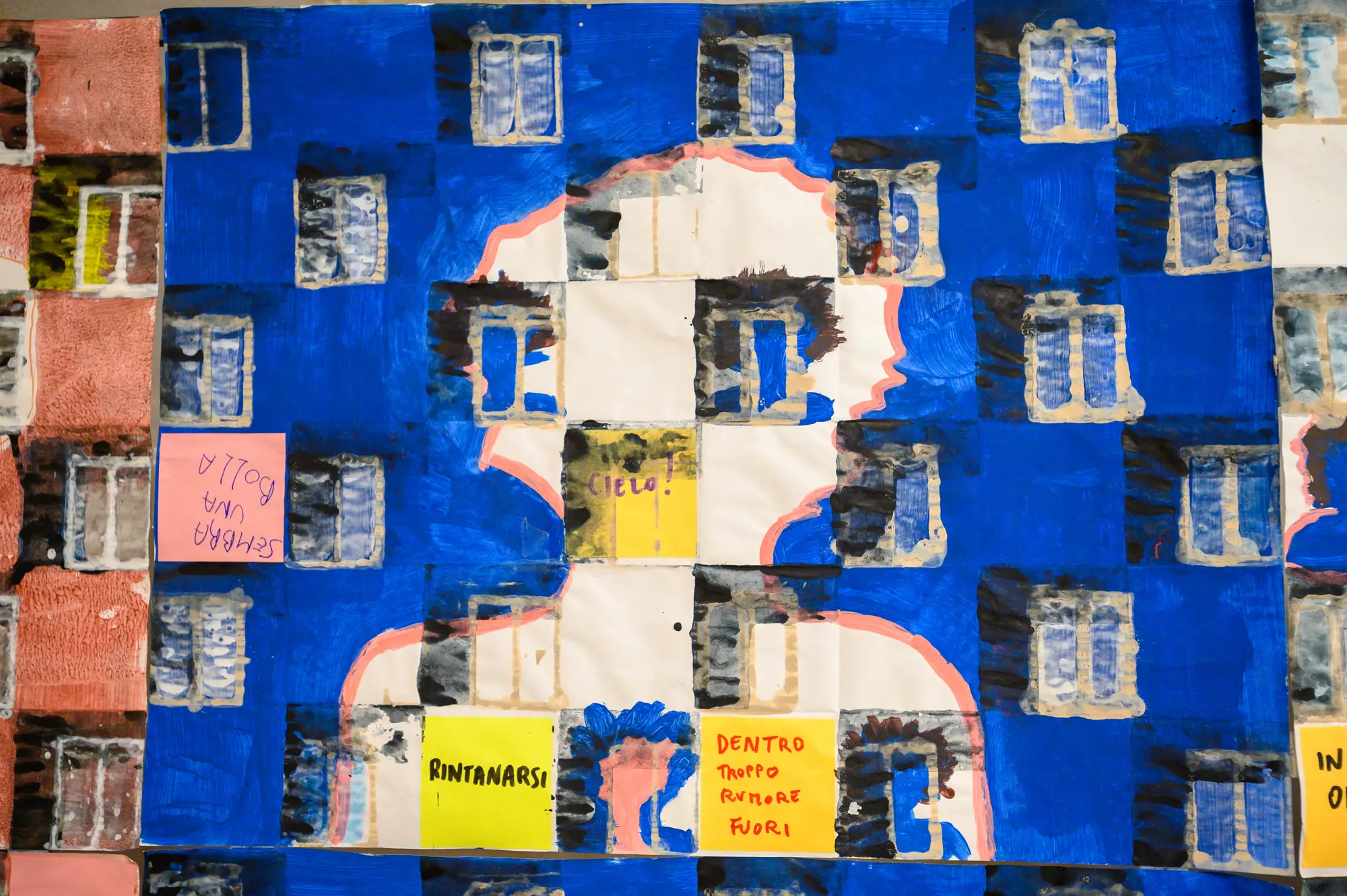 Il risultato è la mostra intitolata “GLI ARTISTI SONO QUELLI CHE FANNO CASINO. Frammenti dal carcere di San Vittore”, che consiste nell’assemblaggio di migliaia di frammenti espressivi su tessere di carta e altri materiali: frasi, pensieri, immagini, disegni, figure che vanno ad occupare tutte le pareti della lunga galleria e, in questo modo, convertono lo spazio chiuso in un nuovo paesaggio urbano.