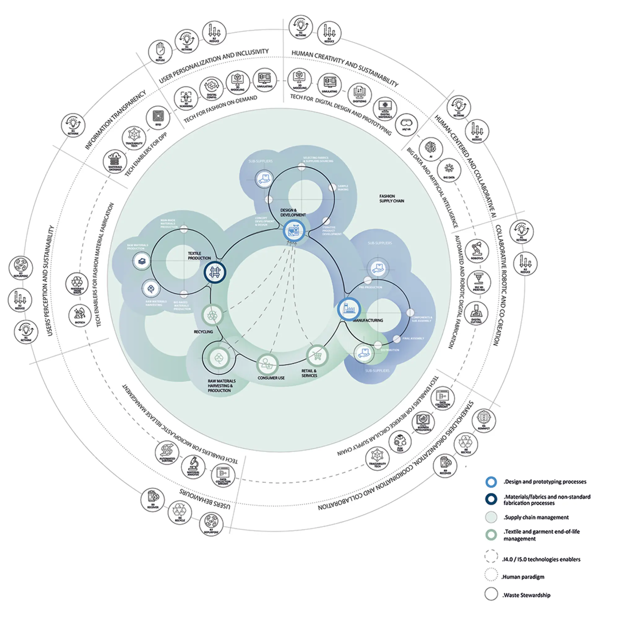 Le scelte e le pratiche progettuali influenzano l’intera catena del valore e di fornitura della moda lungo tutte le sue fasi: dalla prototipazione e produzione, fino alle strategie di vendita e comunicazione, all’uso del prodotto e alla sua fine vita. Il design rappresenta quindi una risorsa strategica per guidare la transizione verso una trasformazione sostenibile del sistema moda, sostenuta da tecnologie I4.0 in grado di migliorare, potenziare o generare nuovi prodotti, servizi, filiere e sistemi circolari, influenzando modelli produttivi e comportamenti di consumo.